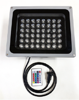 LED数:48灯/多彩パターンをリモコンで選択(本体はメモリー機能付きでリモコンで決めたパターンを維持)/本体サイズ:285×235×135mm/製品重量:約2.4kg/入力電圧:AC100V 50/60Hz/消費電力:12W/防雨仕様