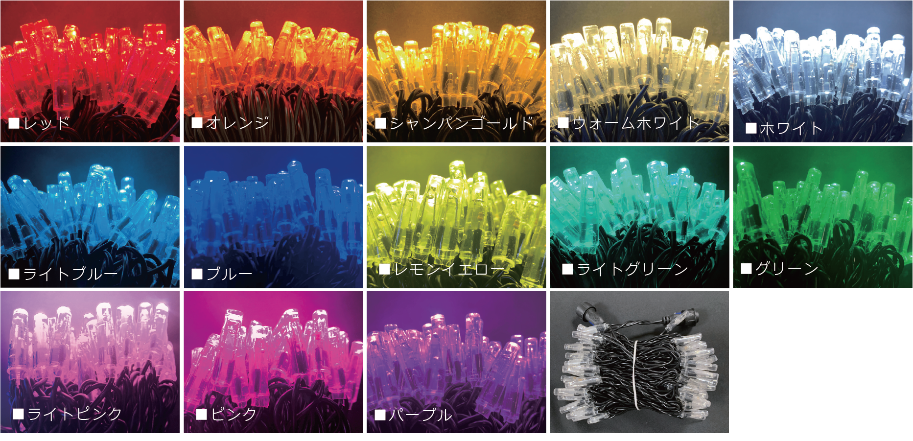 色:レッド・オレンジ・シャンパンゴールド・ウォームホワイト・ホワイト・ライトブルー・ブルー・レモンイエロー・ライトグリーン・グリーン・ピンク・パープル・ライトピンク