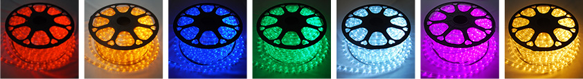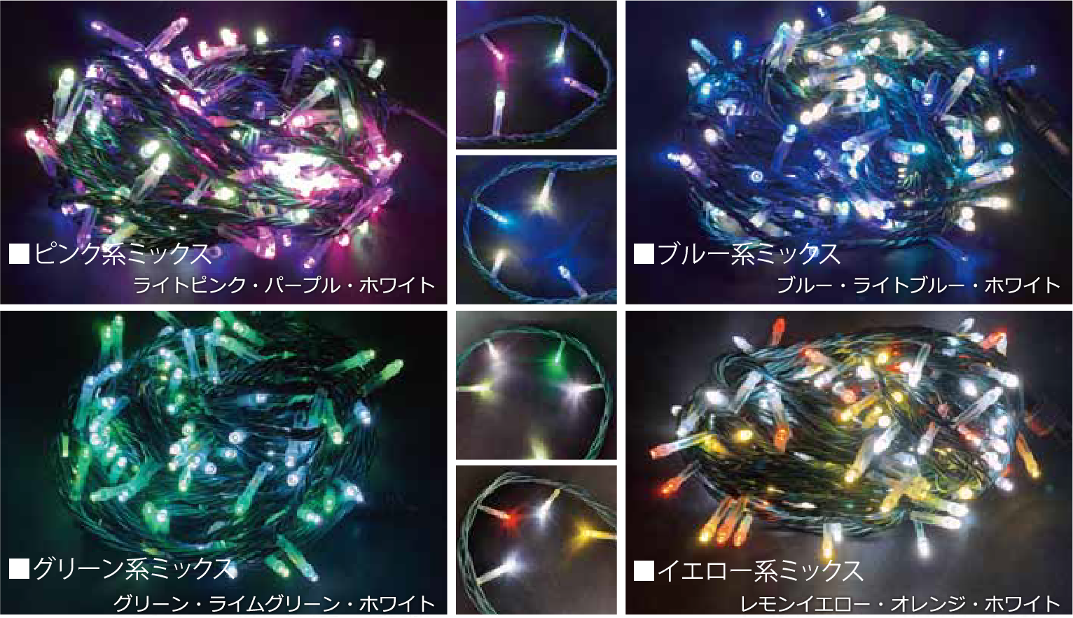 色:レッド・イエロー・ブルー・グリーン・ホワイト・ピンク・シャンパンゴールド 共通仕様 丸型13mm/全長50m巻/カッティングユニット2m/1m辺り36球、約2W/入力電圧:AC100V 50/60Hz/防雨仕様