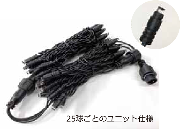 LED球:5mm拡散型高輝度LED/球数:100球/全長約10m(ジョイント含まず)常灯2芯、連結タイプ(LED数1,600まで接続可)/カバー:7mm先平弾丸型AS樹脂、内部AB剤充填/LEDの間隔約10cm/黒コード/入力電圧:AC100V 50/60Hz/消費電力:約9W/防雨仕様