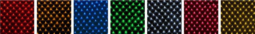 色:レッド・イエロー・ブルー・グリーン・ホワイト・ピンク・シャンパンゴールド LED球:5mm拡散型/球数:180球(1m×2m)10W、252球(2m×2m)15W/入力電圧:AC100V 50/60Hz 黒コード※LED部分はクリアチューブのため四方へ光が拡散します。/連結タイプ/防雨仕様